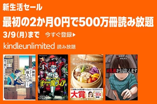 Amazon.co.jpのKindle本ストアでは、電子書籍読み放題サービス「Kindle Unlimited」が2か月無料で利用できる「新生活セール」を実施中です。申込期限は3月9日(月)まで。