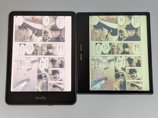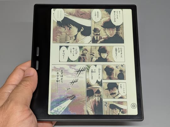 続いて電子書籍ユースにおける表示性能について、両者を比較しながら見ていこう。両者ともに、現在市場で出回っている中でもっともポピュラーなカラーE Inkパネル「Kaleido 3」を採用しており、画面サイズは同じ7型、解像度も同様なので、スペックだけを比べるならば同様ということになる。