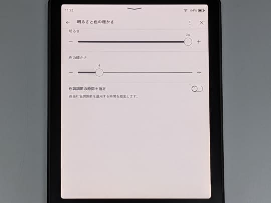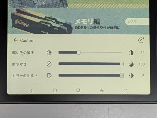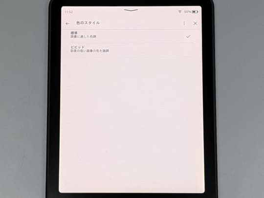 一方の「Kindle」は、あらかじめKindleストア向けに最適化が施されているので手間はかからない。設定はデフォルトのまま変更できず、色のスタイルも[標準]、[ビビッド]の2択のみだが、かといって不自由さは感じない。最大公約数的な設定だが、その最大公約数が感覚的にズレているわけではない点は評価できる。