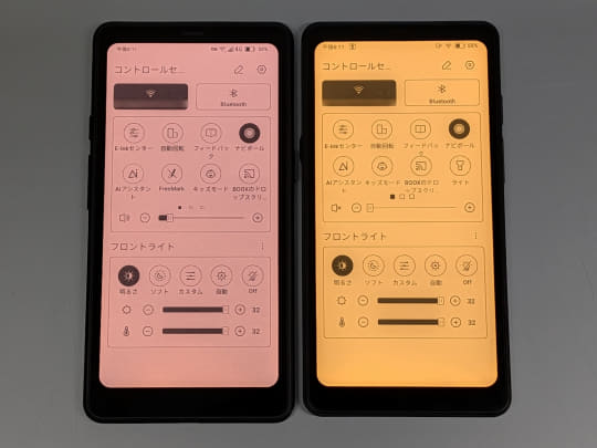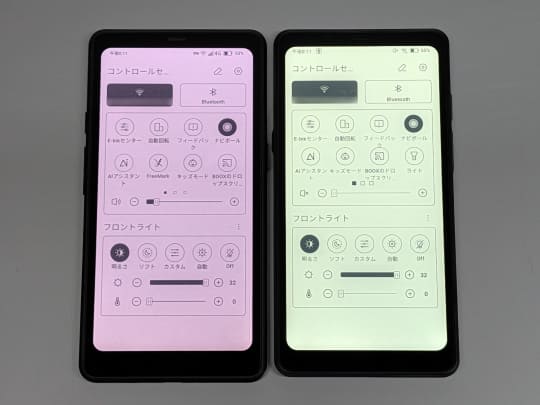 本製品を起動したあとのホーム画面、さらに画面を上から下へスワイプすると表示されるコントロールセンターは、アイコンの配置こそ異なるものの、カラーモデルとモノクロモデルとで大きな違いは見受けられない。特にコントロールセンターは、モノクロモデルと同じ白黒2階調のアイコンなので、配置さえ合わせてやれば見た目に区別はつかない。リフレッシュモードなどの調整を行うE Inkセンターの画面も同様だ。