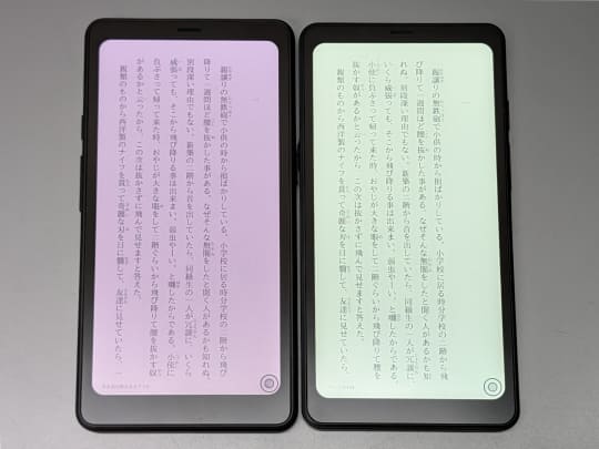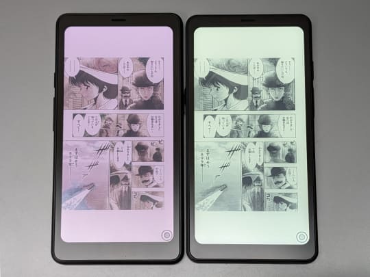 ところでここまでの写真からもおわかりいただけるように、この両製品を使い比べると気になるのは、E Inkの地の色の違いだ。一般的にE InkはフロントライトをONにすることでグレーの背景を白く見せているが、今回紹介しているカラーモデルはこの背景のグレーがかなり濃く、フロントライトをONにしてもグレーの域を脱しない。モノクロモデルと比べた場合のウィークポイントのひとつだ。