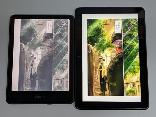 まず目につくのは色合いの違いだ。IPS液晶採用で色鮮やかなFireに対して、KindleのカラーE Inkは全体的に彩度が低く、薄く色がついて見えるという程度でしかない。そのため色合いが重視される写真や、繊細なディティールが売りのイラストの表示には向かない。