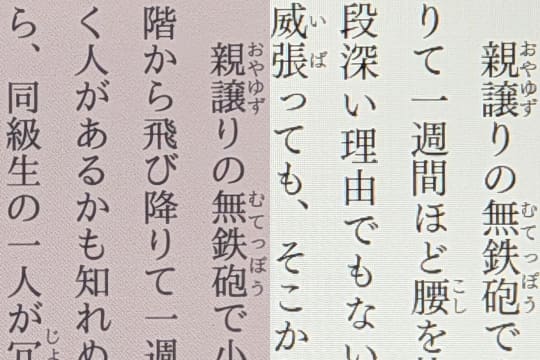 ただしページ書き換え後も画面に表示されたままになる前ページの残像、それを消去するために定期的に発生するリフレッシュなどの挙動は、モノクロE Inkの時と変わらず存在している。E Inkパネルの進化でかなり改善されたとはいえ、人によってはかなり気になる挙動であるため、E Ink未体験の人はモノクロモデルで構わないので、購入前に店頭のデモ機などで確認しておくことをおすすめする。