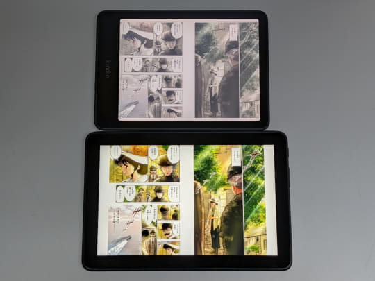 まずは両製品の特徴をひととおり把握しておこう。「Kindle Colorsoft」(以下Kindle)は、7型のスクリーンを採用したカラーE Ink端末で、目に優しく、消費電力が少ないことが大きな特徴だ。Kindleシリーズとしては初のカラーE Ink搭載モデルだが、液晶と比べると色の鮮やかさという点ではやや遅れを取るほか、ページ切替時に残像が発生するなど、E Inkならではの挙動はモノクロE Inkから大きくは変わっていない。