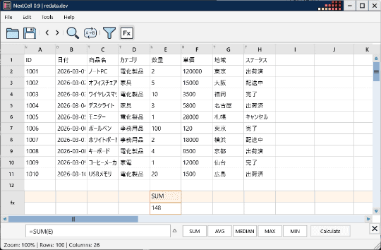 簡易関数機能などを備えたExcel風CSVエディターのβ版「NextCell (beta)」v0.9 ほか