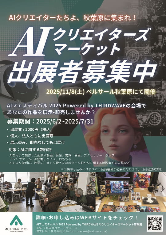 (株)サードウェーブが11月8日に開催する『AIフェスティバル 2025 Powered by THIRDWAVE』の一環として行われる、AIに関する作品などを展示・販売できる「AIクリエイターズマーケット」の出店者エントリー受付を6月2日に開始した。専用フォームで受け付ており、締切は7月31日。