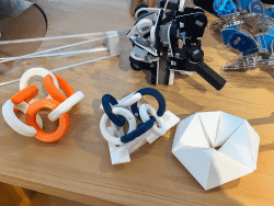 TomoyaTENDOさんは、3Dプリンタ等で作成したパーツを、回転ジョイントでリング状に結合させることで、クルクルと裏返る不思議な構造体「KaleidoCycle」を展示。固い部品でできているはずのものが、柔軟に動いて裏返る様子は、直観にそぐわない不思議な印象を受ける。構成する部品の形状は、円や四角、三角などさまざまあり、TomoyaTENDOさんが自ら試行錯誤しながら作ったものだ。