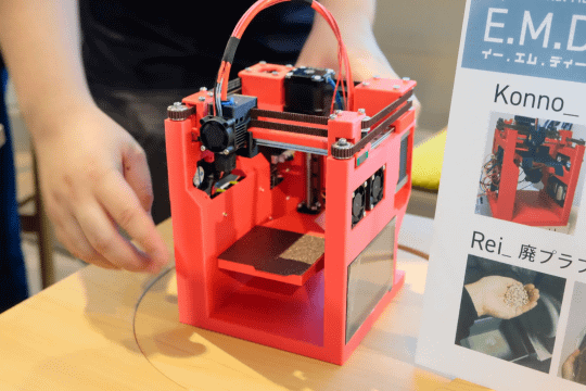 E.M.Dでは小型の3Dプリンタを展示。開発したMasashiさんは本業としてとあるメイカーで3Dプリンターを開発しながら、趣味として小型3Dプリンターを制作したとのこと。部品の多くが3Dプリンター製で、手の平に無理なく載せられるほどのサイズながら、サーボやヘッドなどは汎用部品を用いることで実用的な精度と速度を実現している。