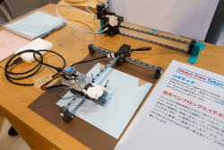 ハギテックが展示したのは、直交する2つのレールとモーターによってペンを動かしてコンピュータによって絵を描くことができる、自作ペンプロッタ。シンプルな構造ながら、4本までペン先を搭載して、多色で描くことができるなどの工夫が見られる。また、軽量なため、紙を垂直に立てた状態でも描くことができるのも特徴のひとつ。