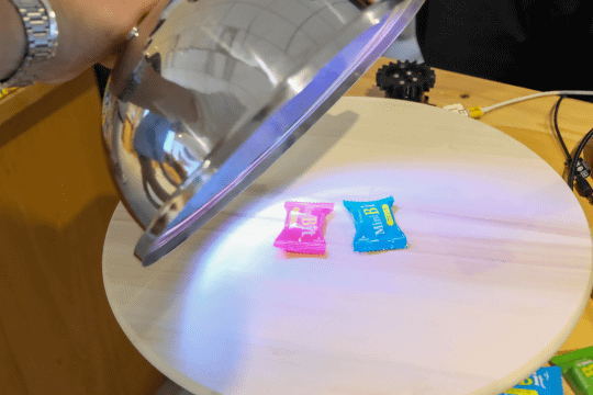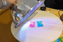 君塚史高さんは、料理をより楽しむことのできる作品作りを行っていた。ひとつは、クロッシュと呼ばれる料理が冷めないように被せるドーム状のフタを開けると、音と光で盛り上げるというもの。クロッシュの裏側にM5Stackが仕込まれており、フタを持ち上げたときの傾きを検知して、LEDを光らせ音を成らすというもの。もうひとつは、中華料理店にある回転テーブルを改造したモノで、テーブルに並んだ料理をカメラで検知し、料理の色によって音色を、回転速度でテンポを検知して曲を作り、演奏するという装置だ。