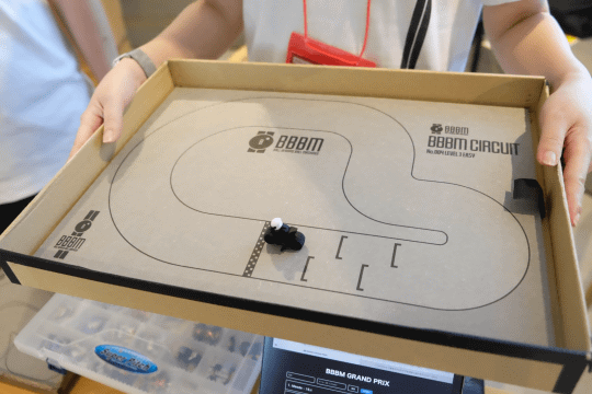 自らモデリングした3Dプリンター製のクルマは、先端部分に金属製のボールが埋め込まれており、箱庭のようなサーキットを傾けると低い方に向かって走り出す。傾きを上手く調整しながらサーキットを周回させる。M5Stackを利用した専用のラップタイマーも開発しているので、本格的にタイムを競って楽しむことも可能だ。