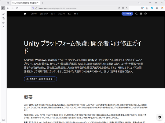 「Unity」ランタイムにリモート攻撃のおそれのある脆弱性、ゲーム開発者は対応を