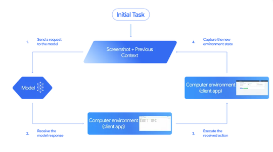 「Gemini 2.5 Computer Use」は、ユーザーリクエスト・スクリーンショット・直近の操作履歴といった入力をもとに、クリック・入力・スクロールなどのUIアクション関数の呼び出しを出力する。初期タスクからスクリーンショットを得て、モデルにそれを入力し、出力されたアクションをクライアントアプリ(Webブラウザー)で実行し、スクリーンショットを撮り、再びモデルへ入力する……というループを繰り返し、与えられた作業を完了するまで行うわけだ。