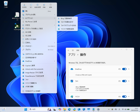 - 「エクスプローラー」でAIアクションが利用可能に。ファイルの右クリックメニューから画像を編集したり、文書を要約したりできる
