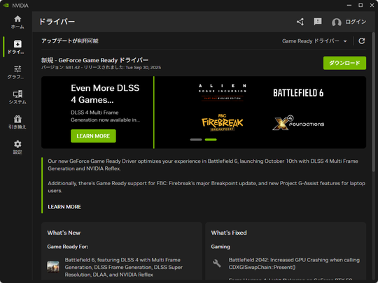 NVIDIA製GPUの最新版ドライバーは現在、公式サイトから無償で入手可能。同社が新たにリリースした「NVIDIA アプリ」からアップデートすることもできる。