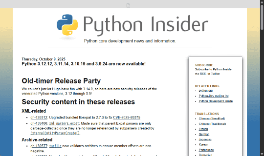 スクリプト言語「Python」v3.12 / 3.11 / 3.10 / 3.9のセキュリティアップデートが、10月9日に実施された。修正版のv3.12.12 / 3.11.14 / 3.10.19 / 3.9.24がリリースされている。