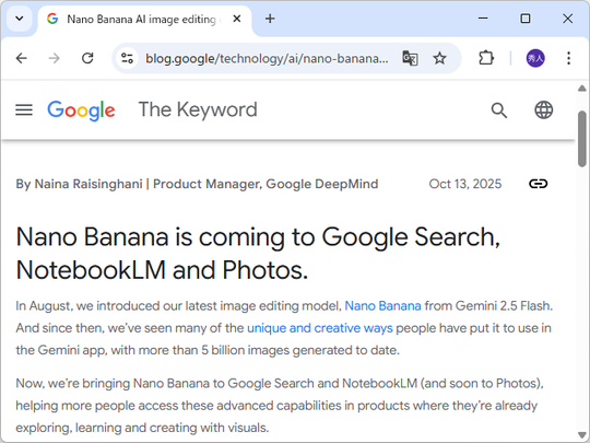 米Googleは10月13日(現地時間)、「Google 検索」と「NotebookLM」に「Gemini 2.5 Flash Image」(Nano Banana)を導入したと発表した。間もなくスマートフォン向けの「フォト」アプリにも導入されるという。