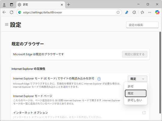 「Edge」で「IE モード」が利用できるかどうかは、[既定のブラウザー]設定画面(edge://settings/defaultBrowser)で確認できる。