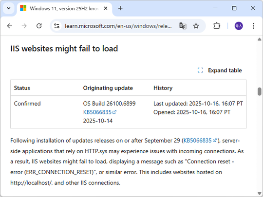 Windowsパッチ「KB5066835」に問題 ~Webサーバー「IIS」に接続不能、エラーが出る