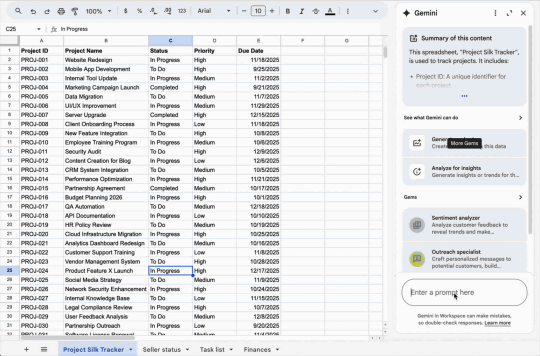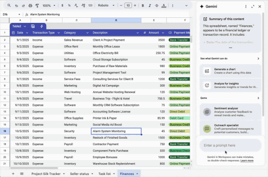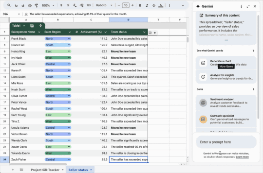 米Googleは10月16日(現地時間)、「Google スプレッドシート」のGeminiが単一のプロンプトから複数のアクションを一度に実行できるようになったと発表した。また、Geminiが行えるアクションの強化も行われている。