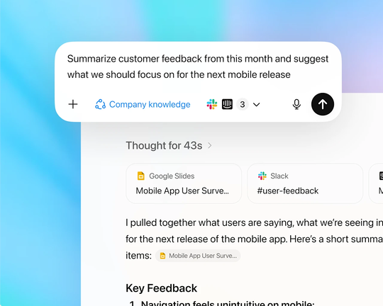 米OpenAIは10月23日(現地時間)、「ChatGPT」の新機能「Company Knowledge」を発表した。「ChatGPT」を企業データと接続し、「GPT-5」ベースのAIモデルで複数のソースを横断した正確かつ網羅的な回答を実現するという。同日より、Business/Enterprise/Eduプランで利用可能だ。