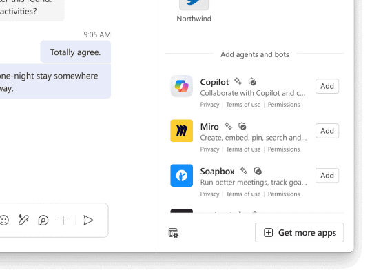 「Copilot」を「Teams」グループチャットに加えるには、既存のチャットに「@copilot」と入力すればよい。「Copilot」をチャットに追加するかどうかを問うポップアップが現れる。チャットの右上にあるユーザー、エージェント、ボットの追加メニューから招待することも可能だ。