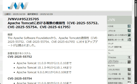 脆弱性対策情報ポータルサイト「JVN」は10月29日、「Apache Tomcat」に3件の脆弱性が存在することを明らかにした。v9 / v10 / v11系統に影響し、最大深刻度はCVSS 3.1のスコアで9.6(CRITICAL)と評価されている。