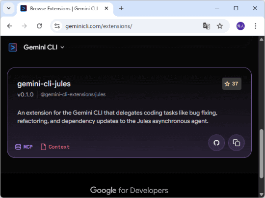 「Gemini CLI」は、ターミナルなどのコマンドラインインターフェイス(CLI)で動作するAIエージェント。今月初めに「Gemini CLI」拡張機能の仕組みが追加され、「Figma」や「Shopify」などのサードパーティー製ツールを簡単に連携させられるようになった。今回リリースされた「Jules」拡張機能も、この仕組みを活用したものだ。