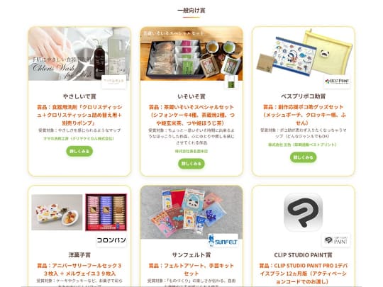 「スポンサー賞」は、靴下屋を運営するタビオ(株)提供のデジタルギフトや、(株)セルシスの提供の「CLIP STUDIO PAINT PRO」アクティベーションコードに加え、各社の食品・雑貨など多岐にわたる。「スポンサー賞」にはそれぞれ受賞テーマが設定されている。