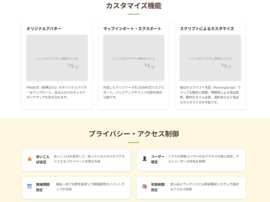 「ツクセカ」はWebブラウザー上で2Dマップを作成・共有して、メタバースのようにオンライン即売会などのイベント会場として利用したり、ゲームや作業部屋にするといった利用が可能なWebサービス。画像のタイルを並べてマップを作成する仕組みで、オブジェクトにWebサイトのリンクやスクリプトの実行を割り当てたり、メッセージや画像が表示されるように設定したりすることが可能で、自由に「セカイ」をつくることができる。マップは複数のユーザーで同時にアクセスして中を移動でき、友人やフォロワーを誘ってリアルタイムに遊ぶことが可能だ。