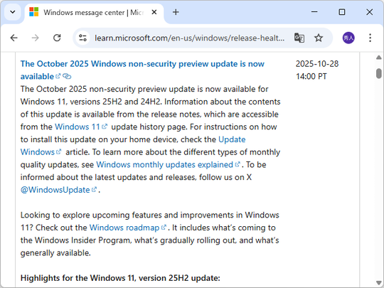 米Microsoftは10月28日(現地時間)、「Windows 11 バージョン 24H2/25H2」の2025年10月非セキュリティプレビュー更新プログラム「KB5067036」をリリースした。これで今月のプレビューパッチが出そろったことになる。
