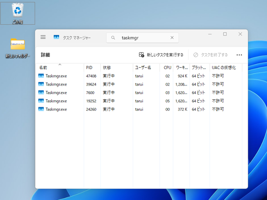 「タスク マネージャー」のインスタンスが残っていることは、[詳細]タブのプロセスリストビューに「taskmgr.exe」が複数存在することで確認できる。