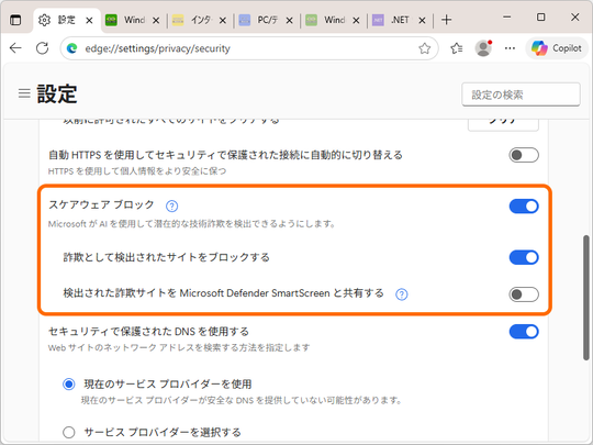 この新しいScarewareセンサーは先日リリースされた「Edge 142」から搭載されている。当面はデフォルトで無効になっているが、[セキュリティ]設定ページ(edge://settings/privacy/security)で有効化できる。これでScarewareセンサーのユーザーベースが広がれば、詐欺情報の共有が迅速に行われるようになるほか、対策の精度向上なども期待できる。