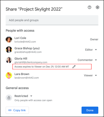 個人のマイドライブでの有効期限の動作も変更される。親フォルダー内のファイルへの一時的な編集者権限を付与していた場合、これまではその有効期限が切れると付与されたユーザーはファイルへの全てのアクセス権を失っていた。今回の変更では、編集者権限が切れた場合、アクセス権が完全になくなるのではなく、そのファイルが含まれるフォルダーの権限に戻るようになる。
