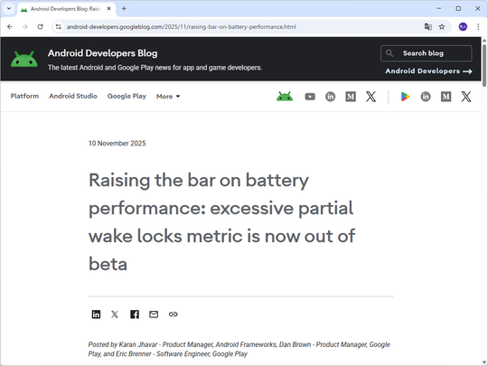 米Googleは11月10日(現地時間)、今年の初めに「Android Vitals」に導入した新しい指標「過度の部分的なウェイクロック」(excessive partial wake lock)をコア指標とすることを明らかにした。これまではベータ版という扱いだったが、2026年3月1日以降は必須となり、この基準を満たさないアプリは「Google Play」ストアで不利な扱いを受ける可能性がある。アプリの開発者は対応と改善が必要だ。