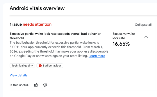 そこで、同社はSamsungと緊密に連携し、「過度の部分的なウェイクロック」指標を策定した。この指標では、すべての「PARTIAL_WAKE_LOCK」利用が24時間に累計2時間を超える場合、「過剰」(excessive)とみなされる(ただし、オーディオ再生やデータ転送といった正当な用途は除く)。そして、「直近28日間で過剰セッションが5%を超える」場合、「Android Vitals」の概要ページにアラートが表示されるようになる。