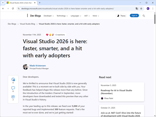 米Microsoftは11月11日(現地時間)、「Visual Studio 2026」の一般提供を開始した。同社の統合開発環境「Visual Studio」の最新版で、9月からInsidersチャネルでプレビュー公開されていた。