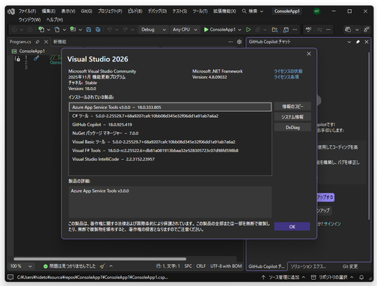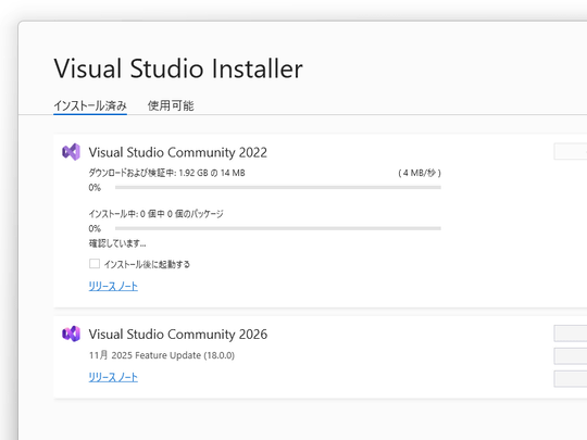 「Visual Studio 2026」は現在、公式サイトからダウンロード可能。無料で使える「Community」エディションも、「Visual Studio 2022」に引き続き提供される。同じ環境に「Visual Studio 2026」と「Visual Studio 2022」を共存させることも可能。「Visual Studio 2022」の拡張機能は、「Visual Studio 2026」でもそのまま動作する。
