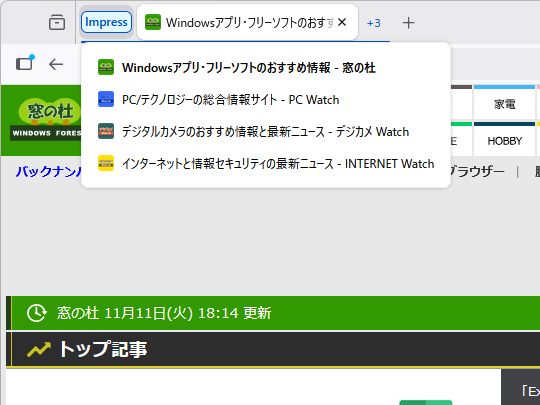 - タブグループのラベルにカーソルを合わせると、含まれているタブ一覧をプレビュー