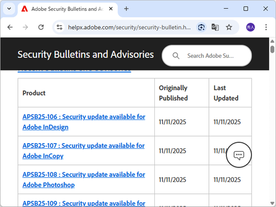 米Adobeは11月11日(現地時間)、月例のセキュリティ情報を発表した。今回は「Photoshop」や「Illustrator」など8製品が対象となっている(括弧内はCVEベースでの脆弱性の件数と最大深刻度)。