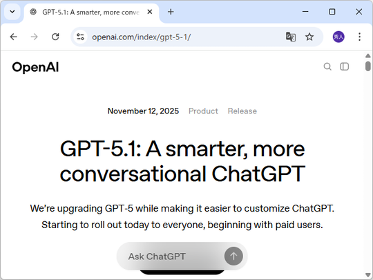 米OpenAIは11月12日(日本時間)、「GPT-5.1」を発表した。「GPT-5」シリーズをアップデートし、以下の新しいモデルを提供する。