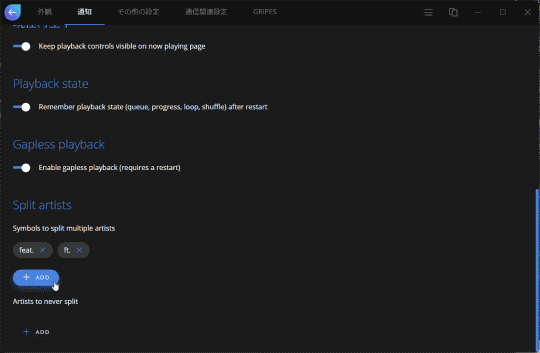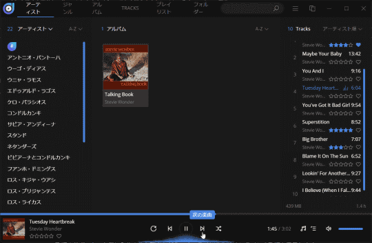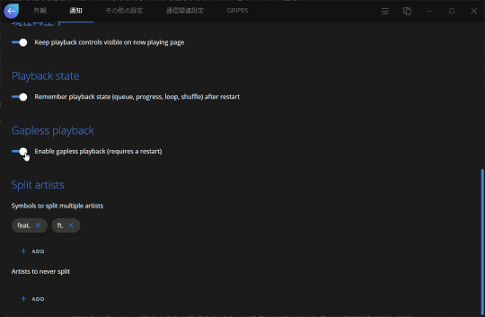 また、昨今増加しているコラボ楽曲に対応するべく、アーティスト名を『ft.』、『feat.』などを区切り文字として分割して認識することも可能。ボリュームスライダーによる音量調整は対数的に行われるようになり、より体感に近い調節ができるようになっている。
