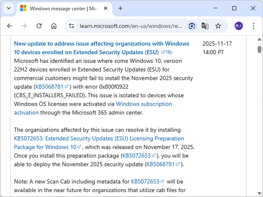 商用顧客向け「拡張セキュリティ更新プログラム」(Extended Security Update:ESU)に登録されている一部のWindows 10デバイスで、2025年11月のセキュリティパッチ「KB5068781」を適用しようとすると、インストールエラー「0x800f0922」(CBS_E_INSTALLERS_FAILED)が発生して失敗する問題が発生していたとのこと。米Microsoftが11月17日(現地時間)、この問題を解決する「KB5072653」をリリースした。