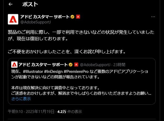 米Adobeは11月19日(日本時間)、複数のアドビアプリケーションにおいて発生した大規模障害は復旧したと発表した。「アドビ カスタマー サポート」の公式Xアカウントにて、全ユーザーに対して謝罪文の掲載とともに告知している。