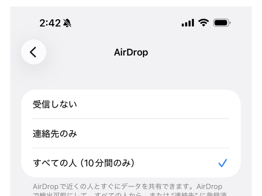 なお、「AirDrop」の共有先が[連絡先のみ]になっていると、「Quick Share」からファイルを送信できない点には注意。共有先を[すべての人(10分間のみ)]に切り替えて、共有を待機する必要がある。Googleは[連絡先のみ]でもコンテンツを共有できるようにすることに意欲的で、Appleの協力を歓迎するとしている。