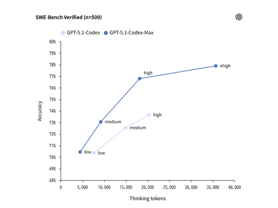 さらに、「GPT-5.1-Codex-Max」は推論能力の向上によりトークン効率が大幅に向上。推論を「medium」に設定している場合、「GPT-5.1-Codex-Max」は「GPT-5.1-Codex」よりも高いパフォーマンスを発揮する一方で、思考トークンの使用数は30%も少なく抑えられている。また、「GPT-5.1-Codex-Max」には従来の「high」推論を超える「xhigh」推論も導入されており、より長い時間をかけてじっくり課題に取り組むことも可能。通常は「medium」で十分だが、必要であれば「xhigh」でより難しいタスクを任せることもできる。
