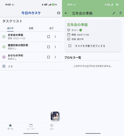 サイドポニーの美少女が『サボってないでさっさとやれ』、『仕事が全然進んでないじゃないか』、『甘えるな』などと、愛のある(?)厳しいコメントでタスクの管理を促してくれるので、そういうのに弱い人、かえってモチベーションが上がる人には効果があるかもしれない。