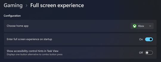 なお、ゲームの操作に集中できるように、「Xbox FSE」では一部のキーボードショートカットキーが通常のデスクトップと異なる仕様になるとのこと。通常のデスクトップへ戻るには、タスクビューから切り替えるか、「Game Bar」の設定で「Xbox FSE」を終了するか、キーボードの[Windows]キーを押せばよい。