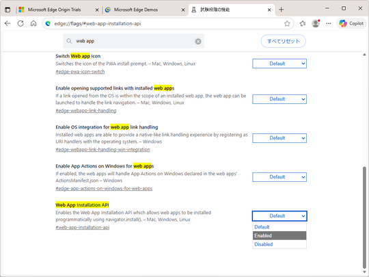 なお、開発デバイスでローカルテストしたい場合は、試験フラグ(edge://flags/#web-app-installation-api)を有効化してもよい(「Edge」の再起動が必要)。
