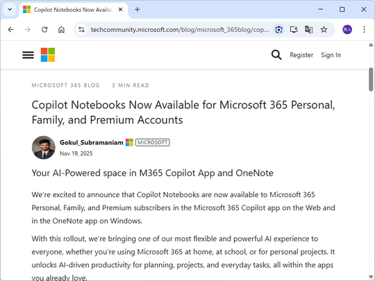 米Microsoftは11月19日(現地時間)、「Copilot Notebooks」が「Microsoft 365」の消費者向けプラン(Personal、Family、Premium)で利用可能になったと発表した。